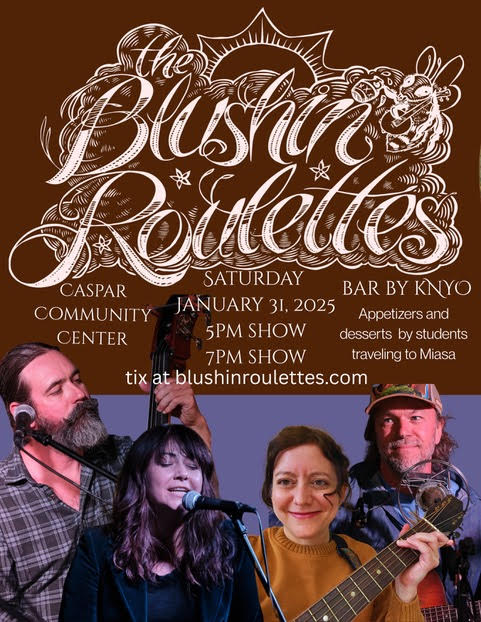 The Blushin’ Roulettes, one of the North Coast’s favorite bands, will host two shows as fundraisers for students to travel to Mendocino’s Sister City, Miasa-Omachi, located on Japan’s main island of Honshu, at the Caspar Community Center, 15051 Caspar Rd, Caspar, CA 95420, on Saturday, January 31, 2026. The event is also a benefit for KNYO, which will be hosting the beverage bar, sponsored by North Coast Brewing. Shows start at 5:00 pm and 7:00 pm.