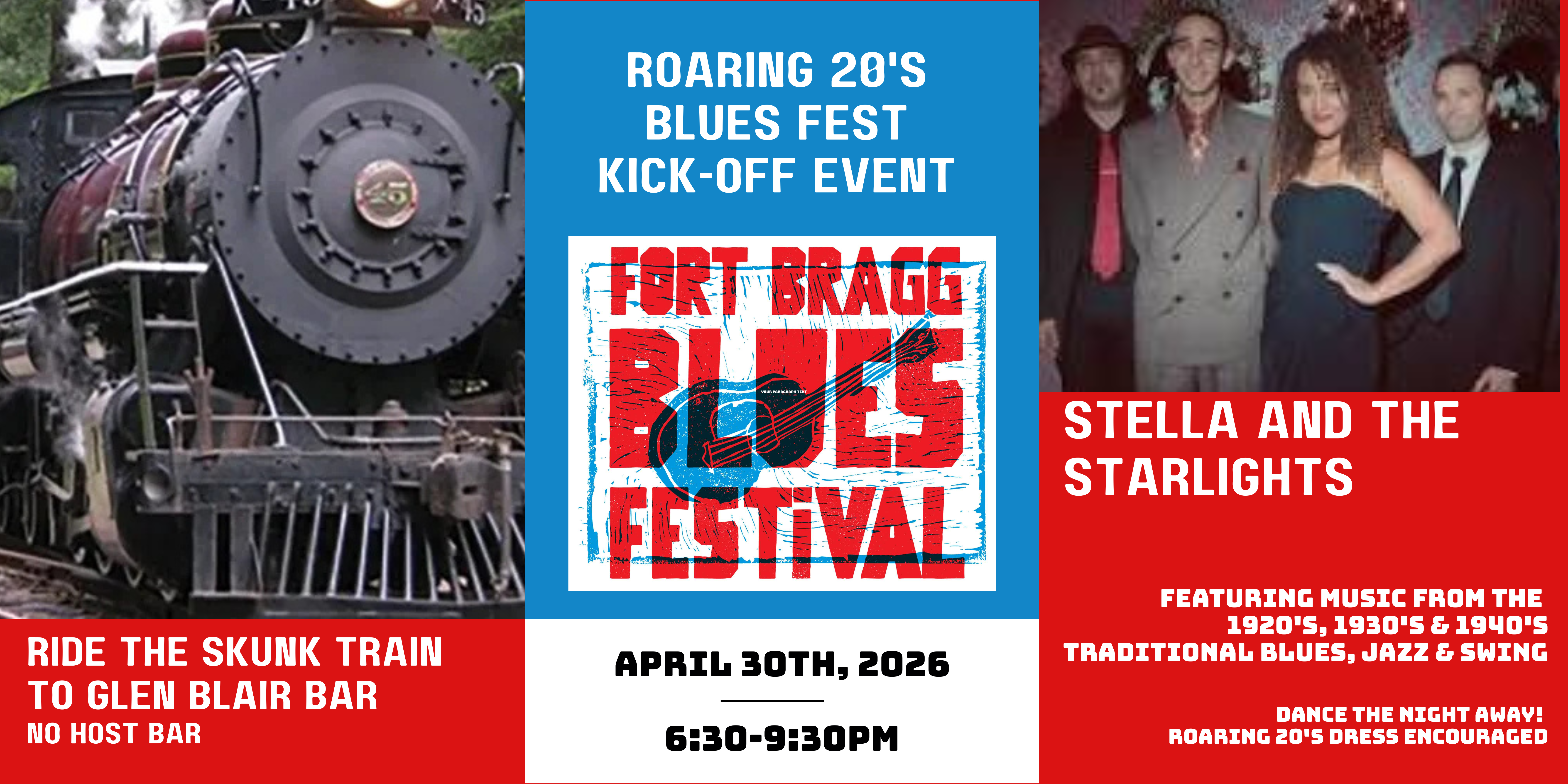 Fort Bragg Blues Festival Roaring 20’s Kick-off Party with Ride on the Skunk Train